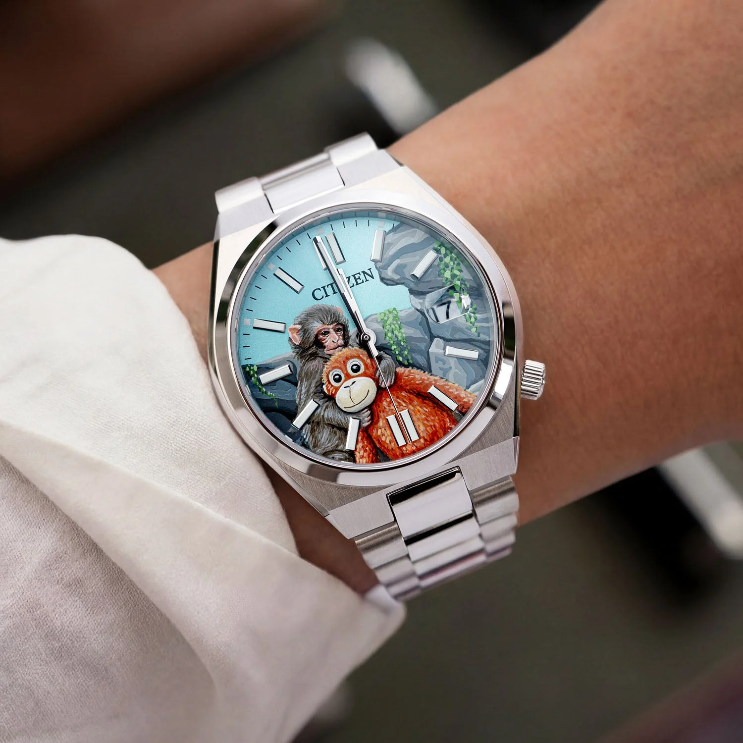 In July 2025, a baby Japanese macaque was born at Ichikawa City Zoo — and abandoned by his mother within days. The zookeepers gave him something to hold onto: a stuffed orangutan plushie that became his surrogate, his comfort, his constant companion. This hand-painted custom dial captures that bond in tender detail — a young snow monkey clutching his orange plushie against a backdrop of weathered rocks and trailing green ivy beneath a soft blue sky. Named after the little macaque who captured hearts around the world, Punch is a reminder that love finds a way, even in the most unlikely places.